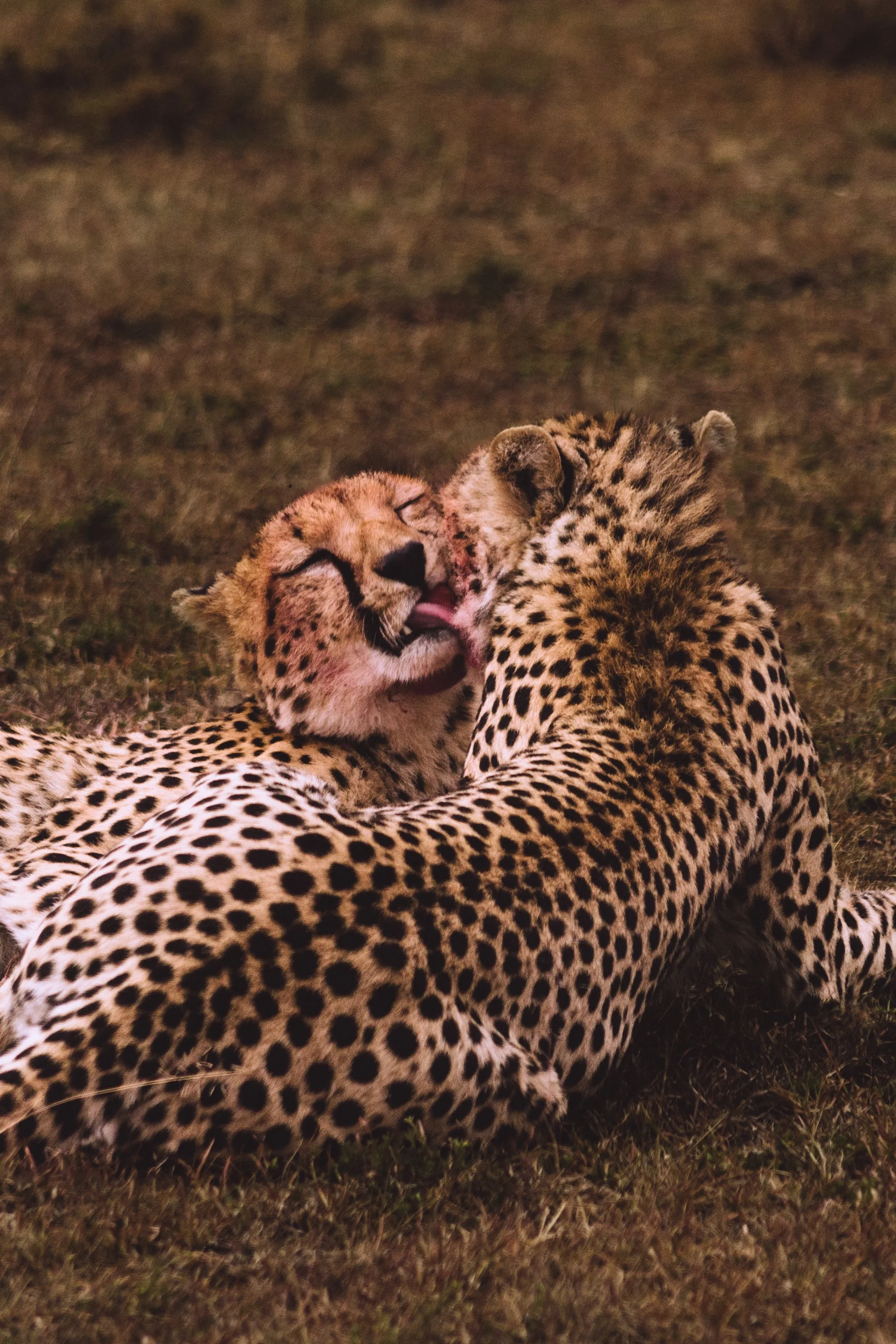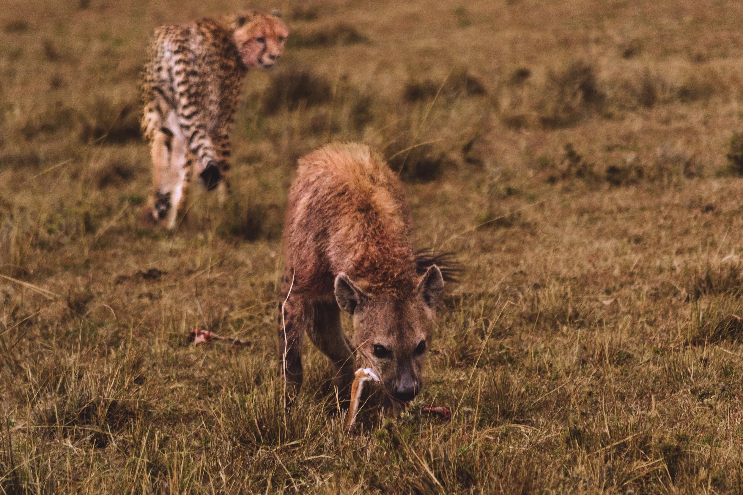 Special encounter w/ 3 cheetah siblings eating their evening meal when a solo hyena shows up and steals their scraps. Luckily they eat fast and just get up + walk away. Incredible seeing the interaction between two species in the wild.