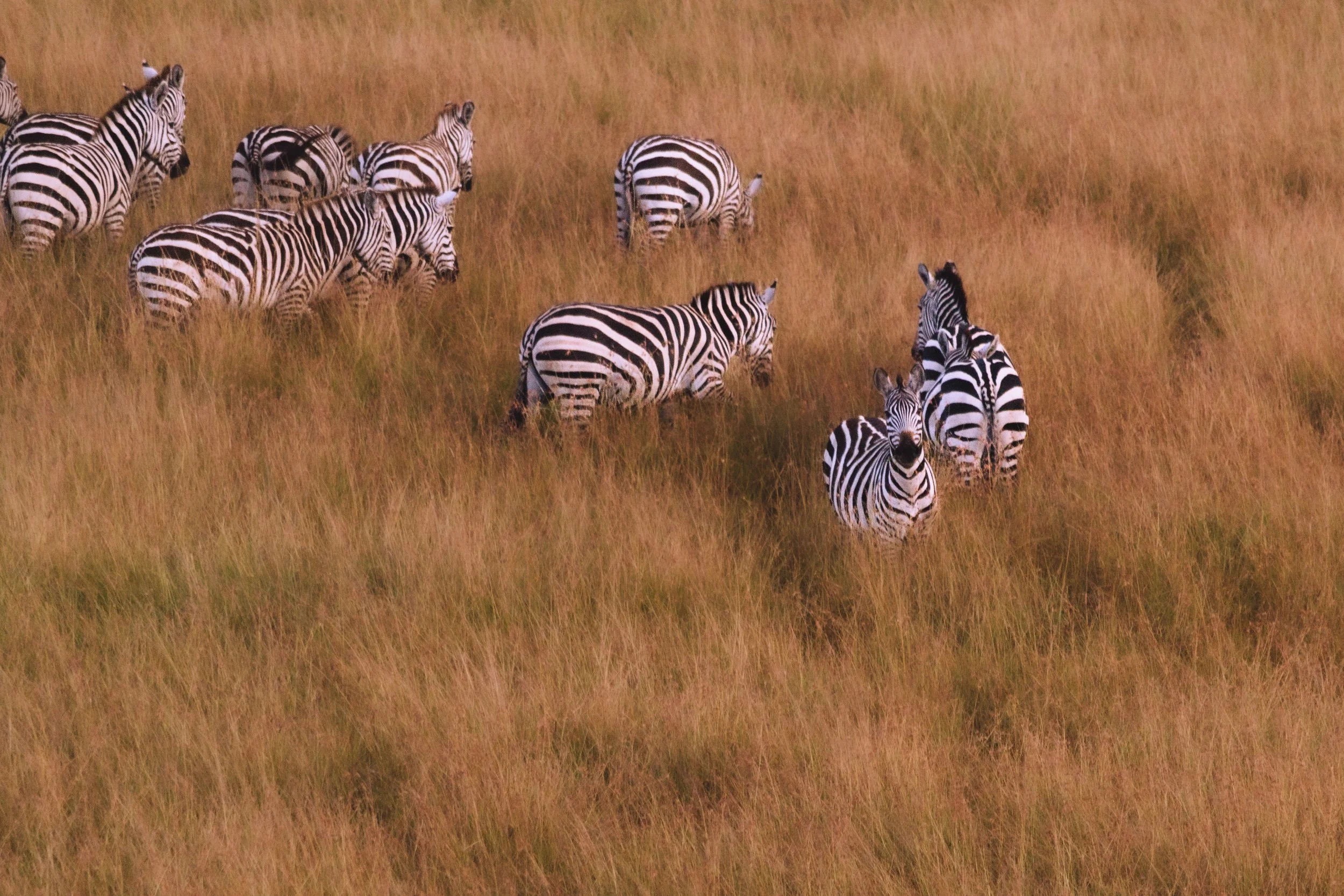 We see giraffe, herds of roaming zebra and wildebeest, hippos traversing the river, and wave to the people in a camp as we pass by overhead.