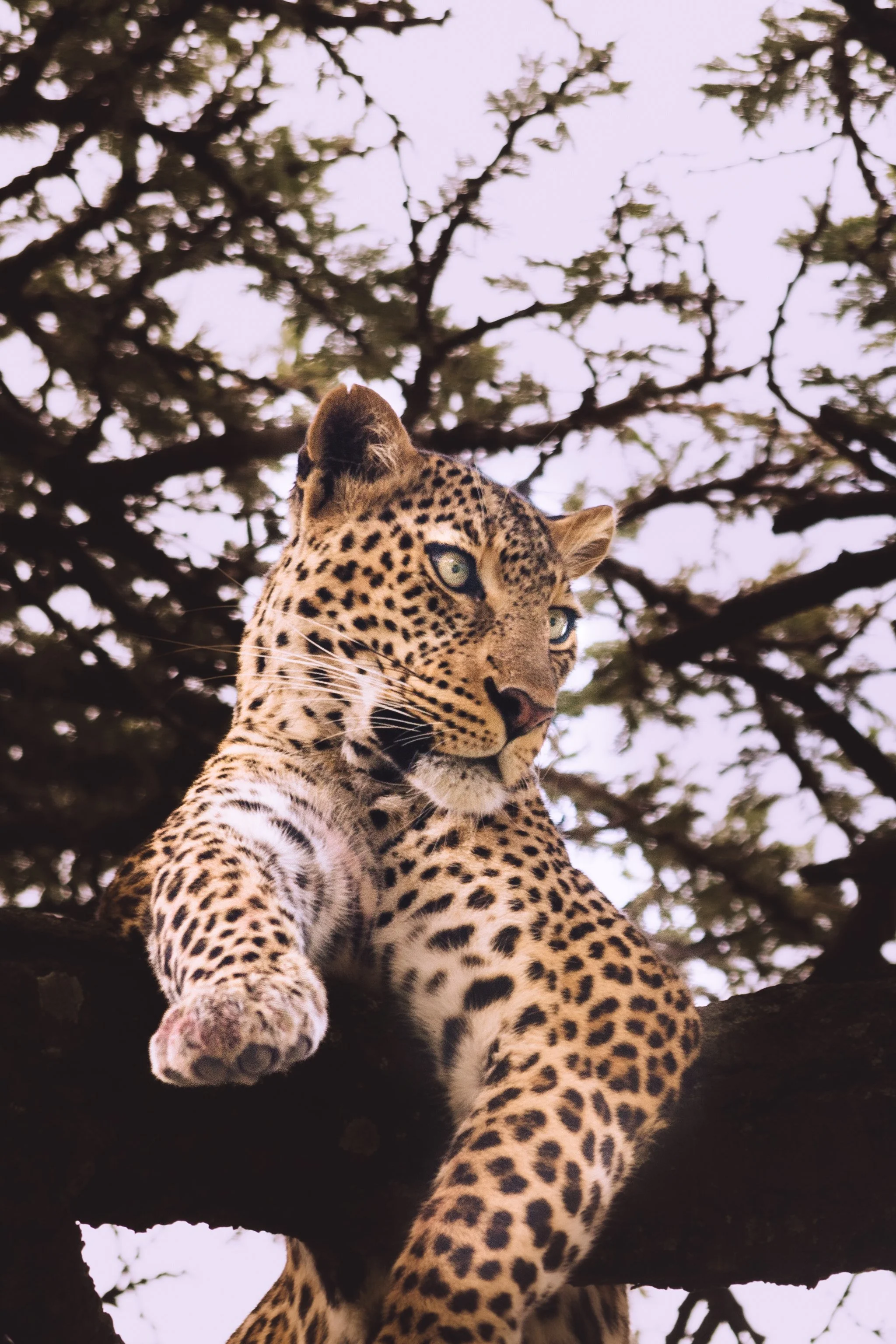 A leopard finishing dinner high up in an acacia tree, hyenas prowling at the base