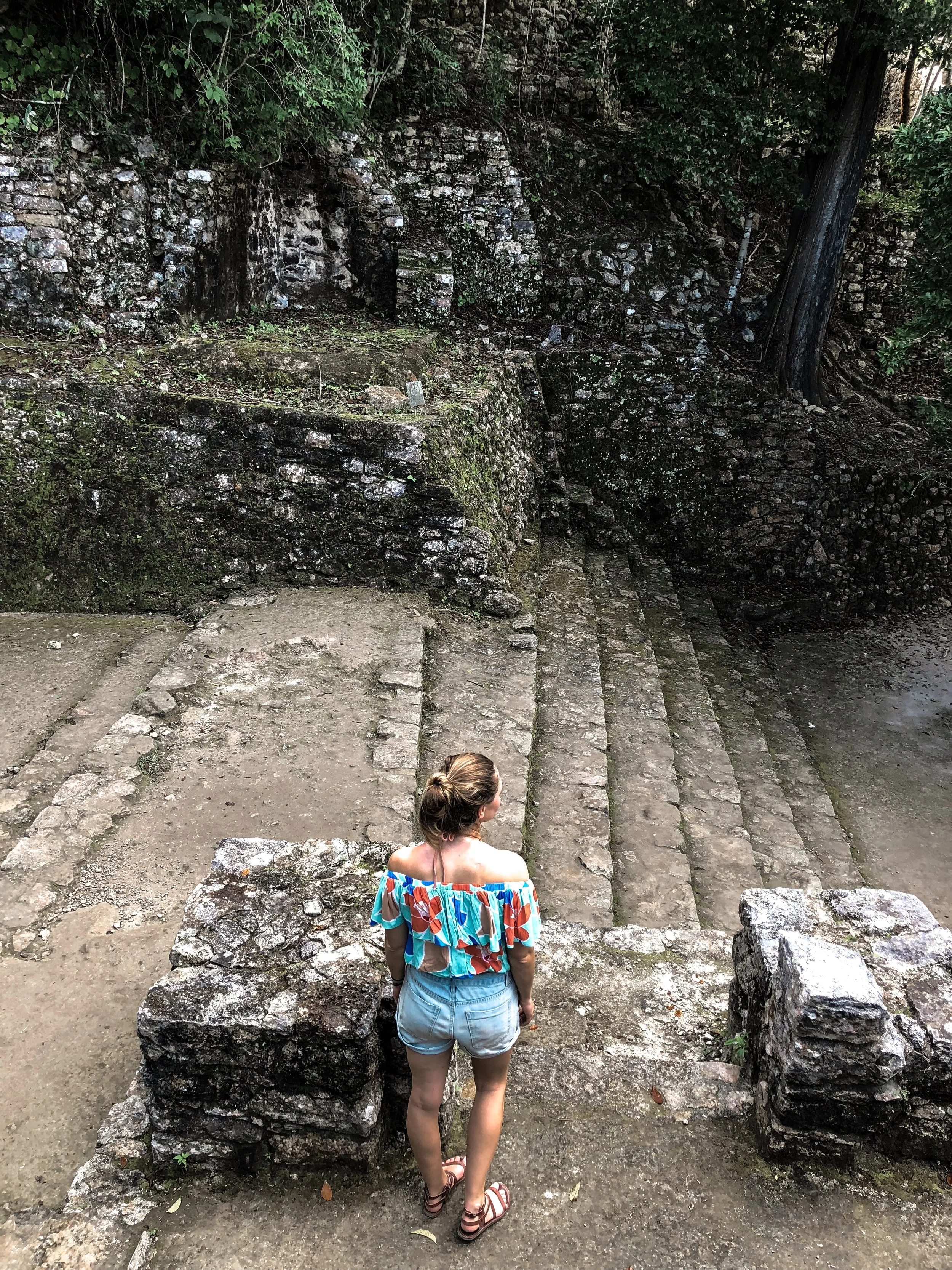 So we rented bikes and started off through the jungle to the various ruins until we came to the heart of the city, the pyramid Ixmoja. We climbed up 138 ft (42m) of steep steps to the top to behold the astounding views of the jungle in every direction. The sun beat down on us as we gazed out at miles and miles of trees. In the distance, we could see mounds of unexcavated Mayan structures rising above the jungle canopy. The view from the top of the pyramid really gave us an understanding of how rugged and expansive the site of Coba was.